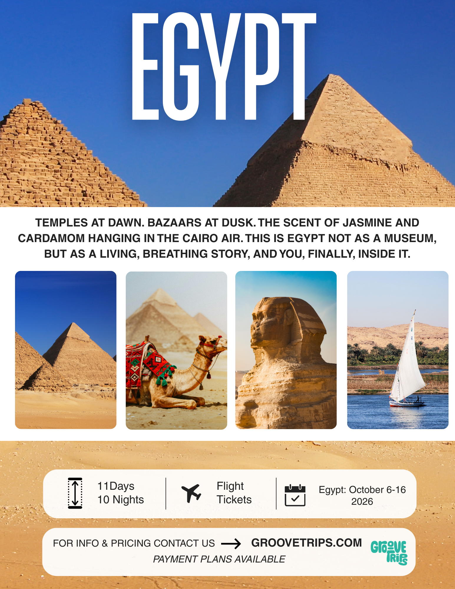 This is Egypt, stripped of distance. Not viewed through a bus window, but felt beneath your fingertips and tasted in the dust-laden air.