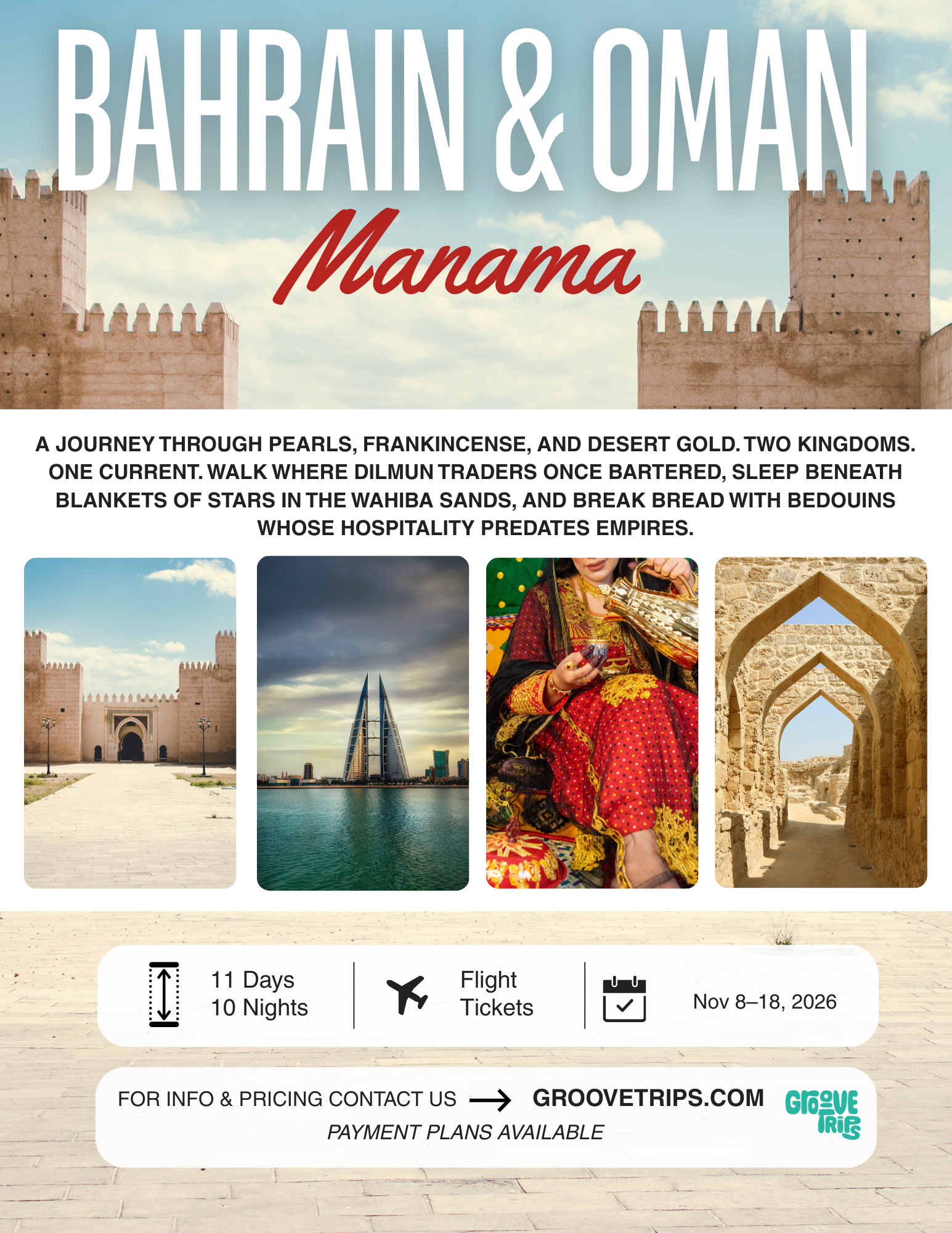 You begin in Manama, the ancient heart of Dilmun, where you descend into burial mounds that predate the pyramids and wander the gold souk as the call to prayer unfurls overhead. You trace pearling paths along the shores of Muharraq, then cross the causeway toward a different rhythm.